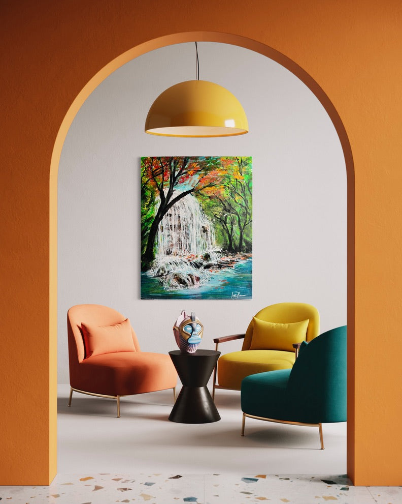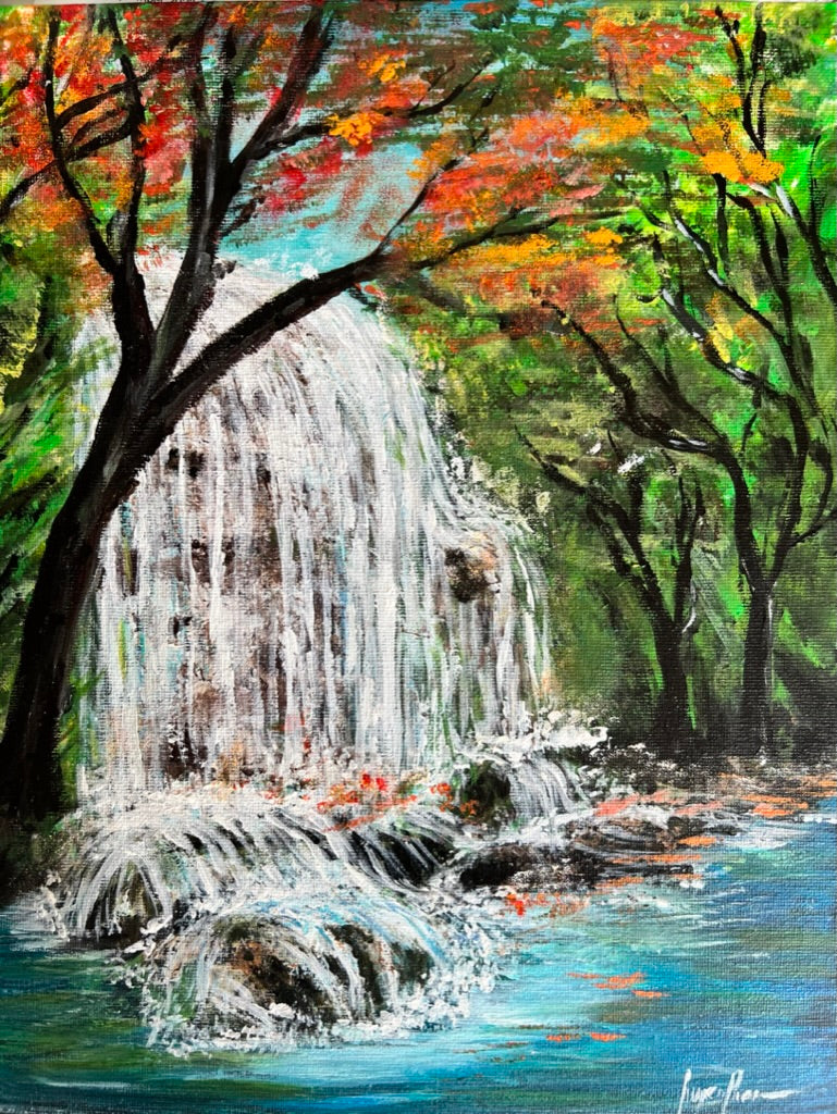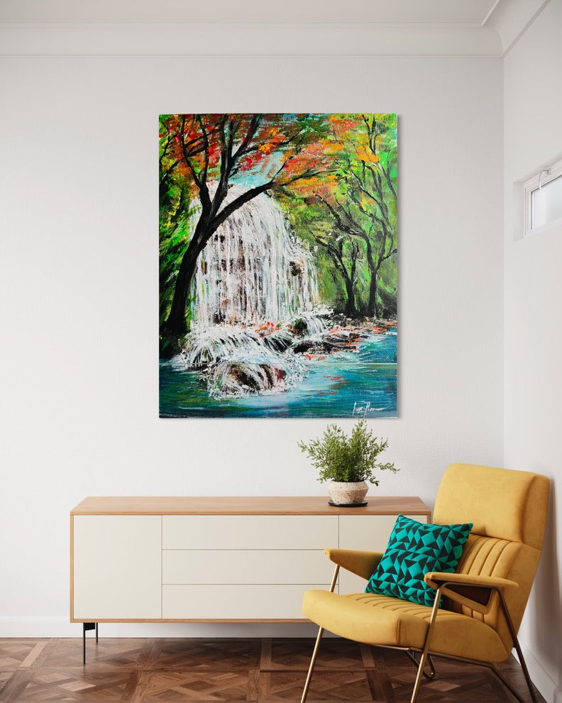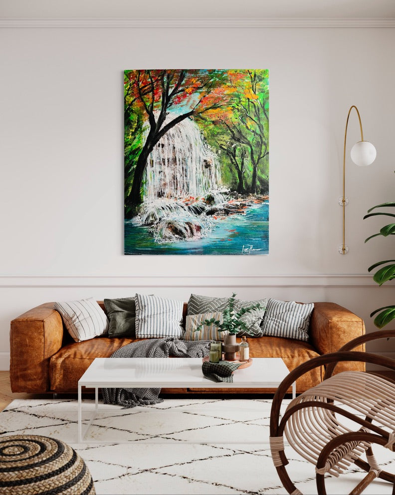 Experience the serene beauty of autumn with AUTUMN CASCADE! Let the colorful leaves, soothing waterfall, and lush greenery transport you to a state of relaxation. The crystal water adds to the tranquility of the environment. Escape the hustle and bustle and immerse yourself in this peaceful oasis.