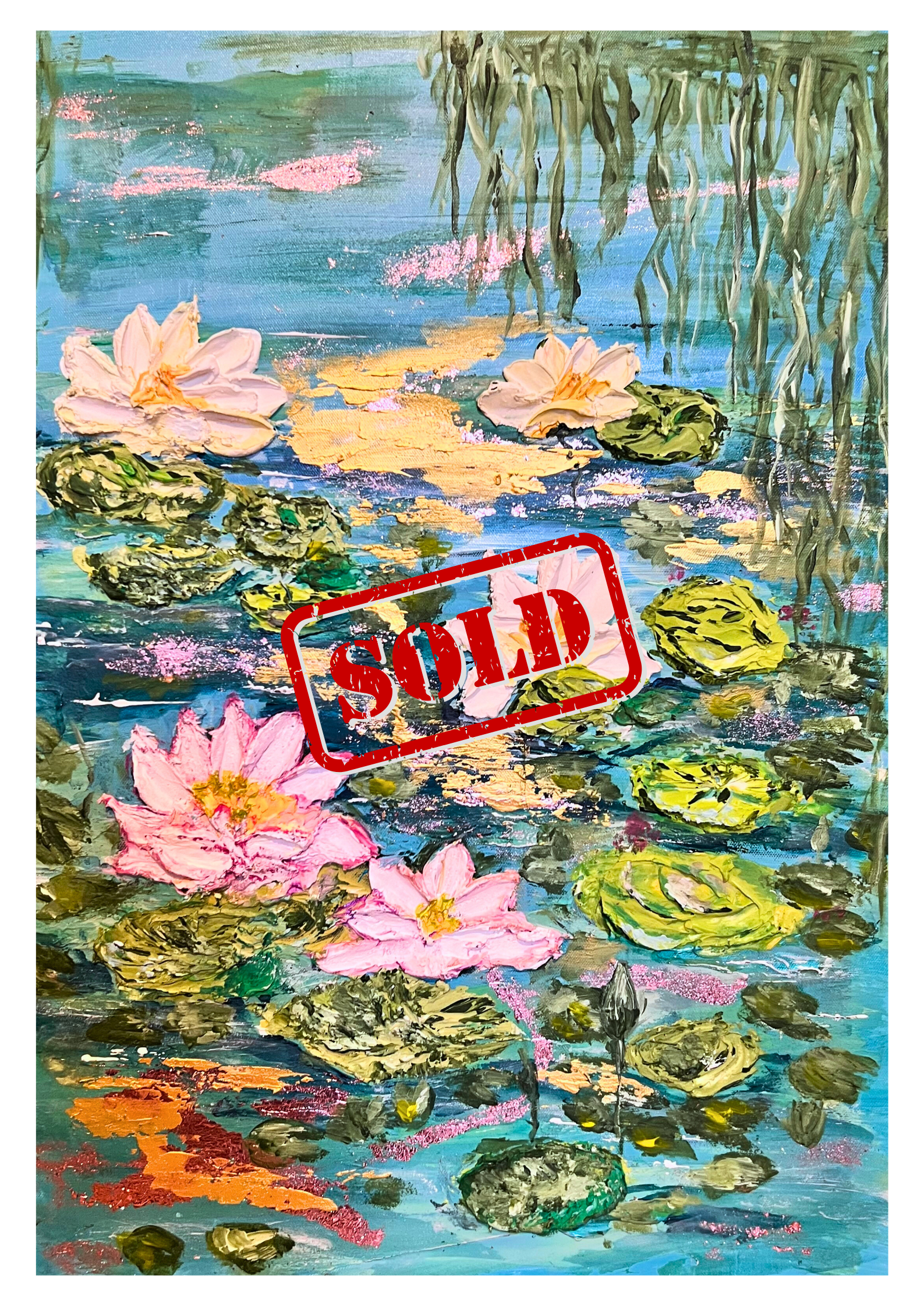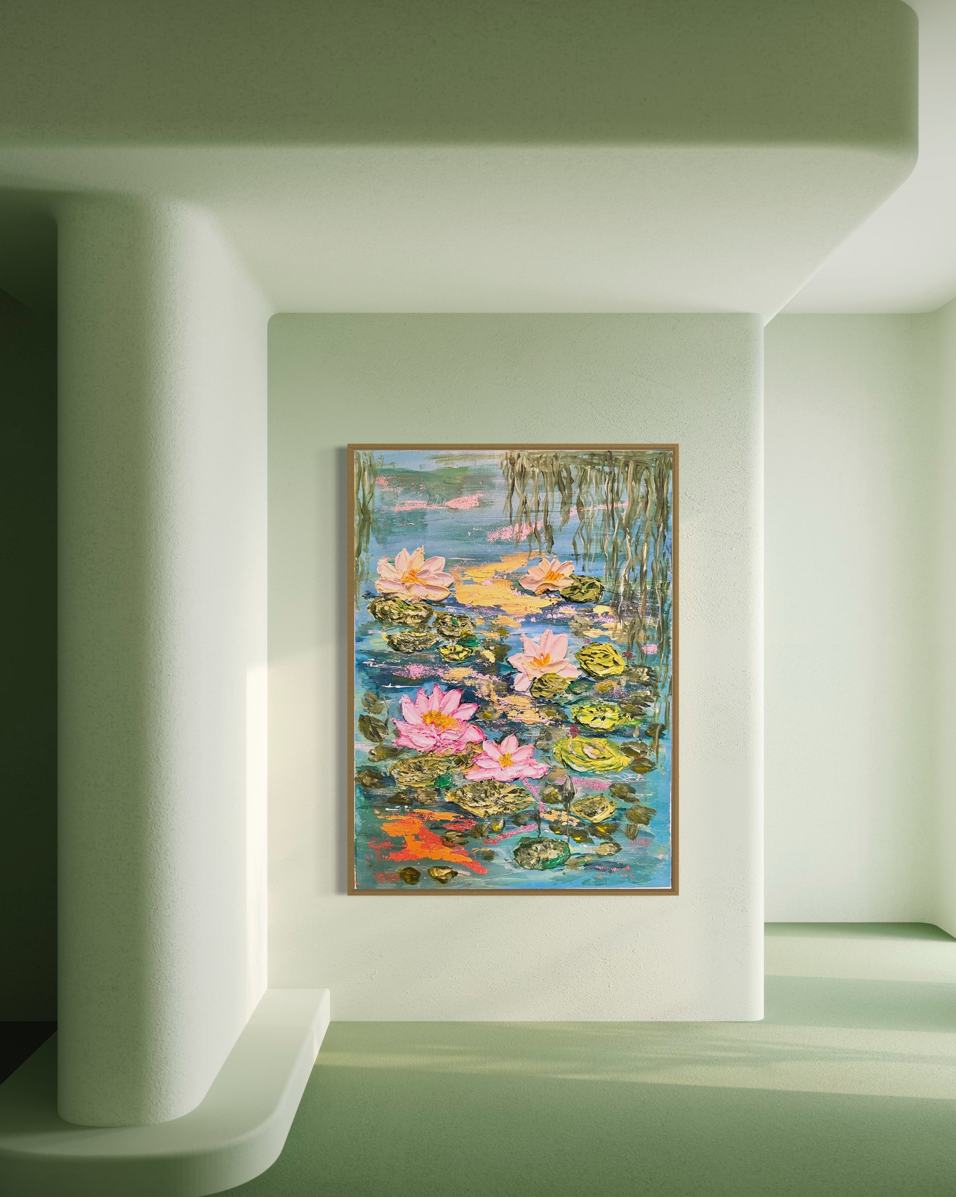 Elevate your home decor with DIVINITY-TEXTURED PAINTING. This unique art piece features a 3D sense of a beautiful Lotus, brought to life with textured paint and golden shimmer accents. Add depth, interest, and style to any room with this stunning piece.