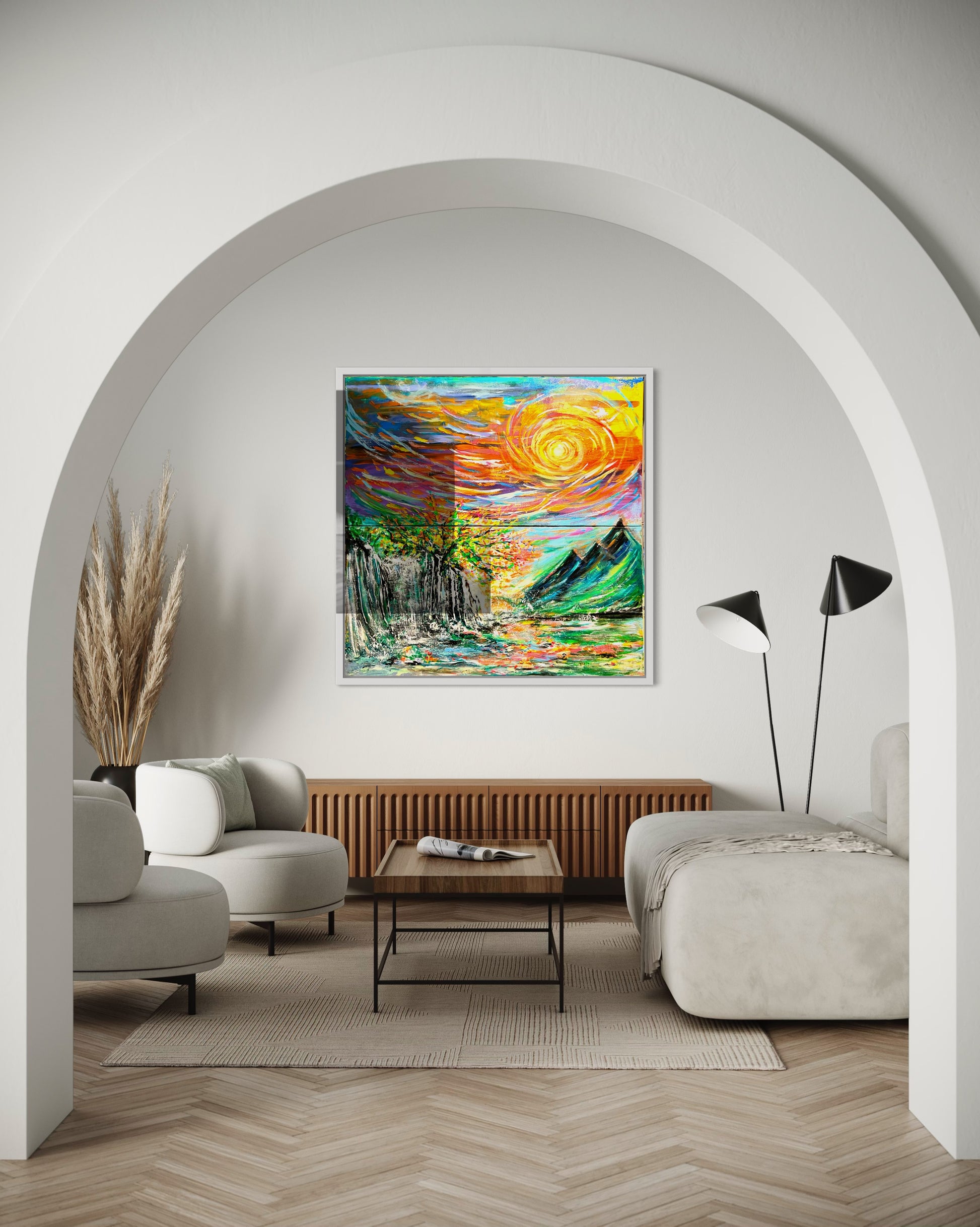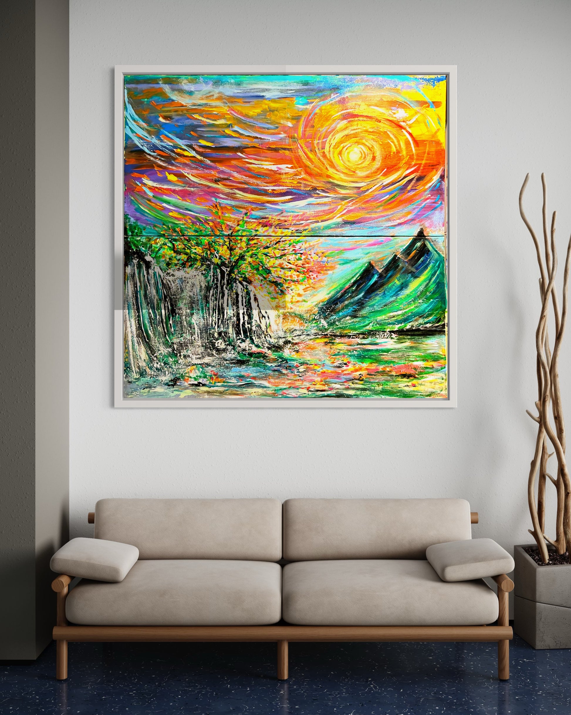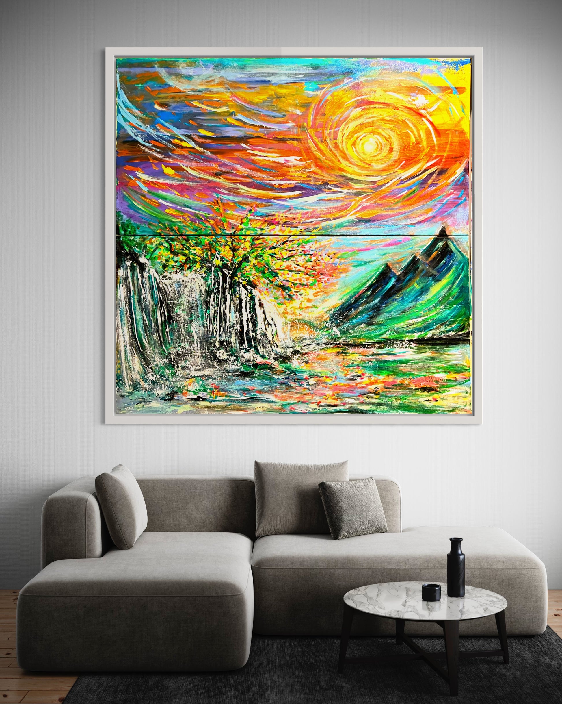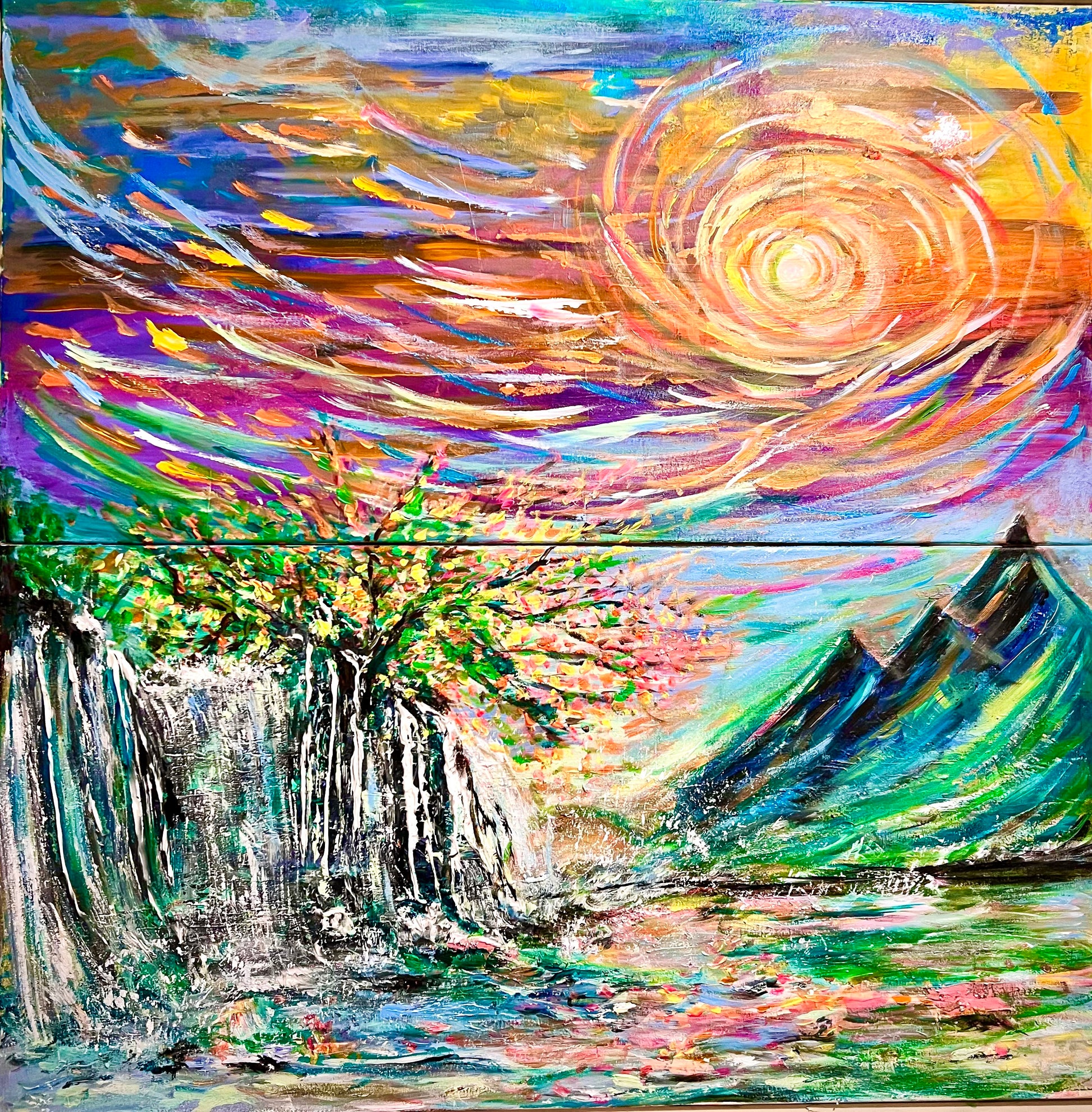 Experience the beauty of nature with "It's all connected" painting. The vibrant colors depict how everything in life is interconnected - from the sky above to the mountains and water below. With its large size, this painting will bring life and inspiration to any space. Let it be a reminder of the true colors of life!