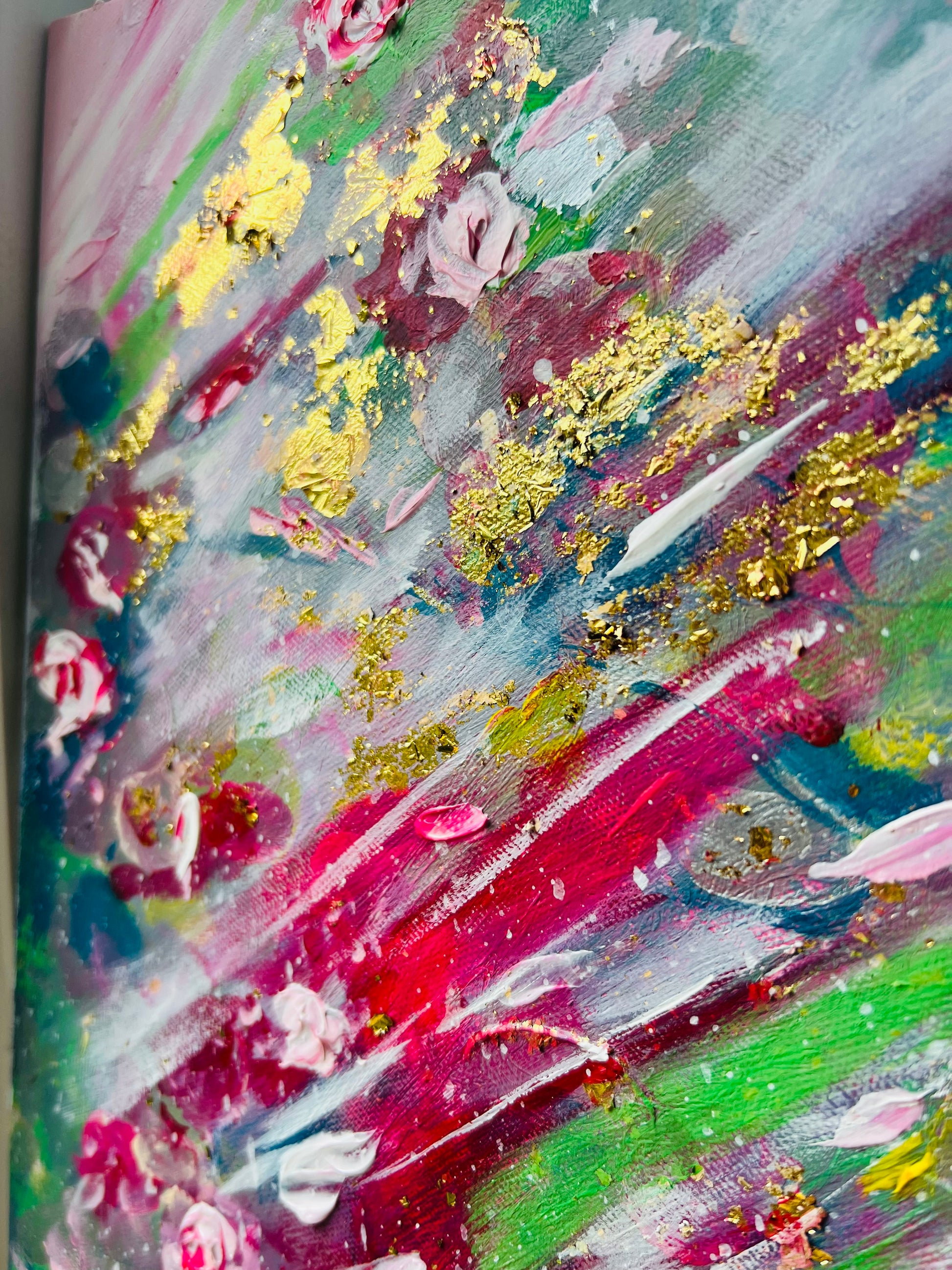 Large Flower Painting Pink Rose Painting | Gold Leaves | Wall Art Rose Flower| 3D Abstract Canvas Floral Wall Art Pink Rose Flower Painting