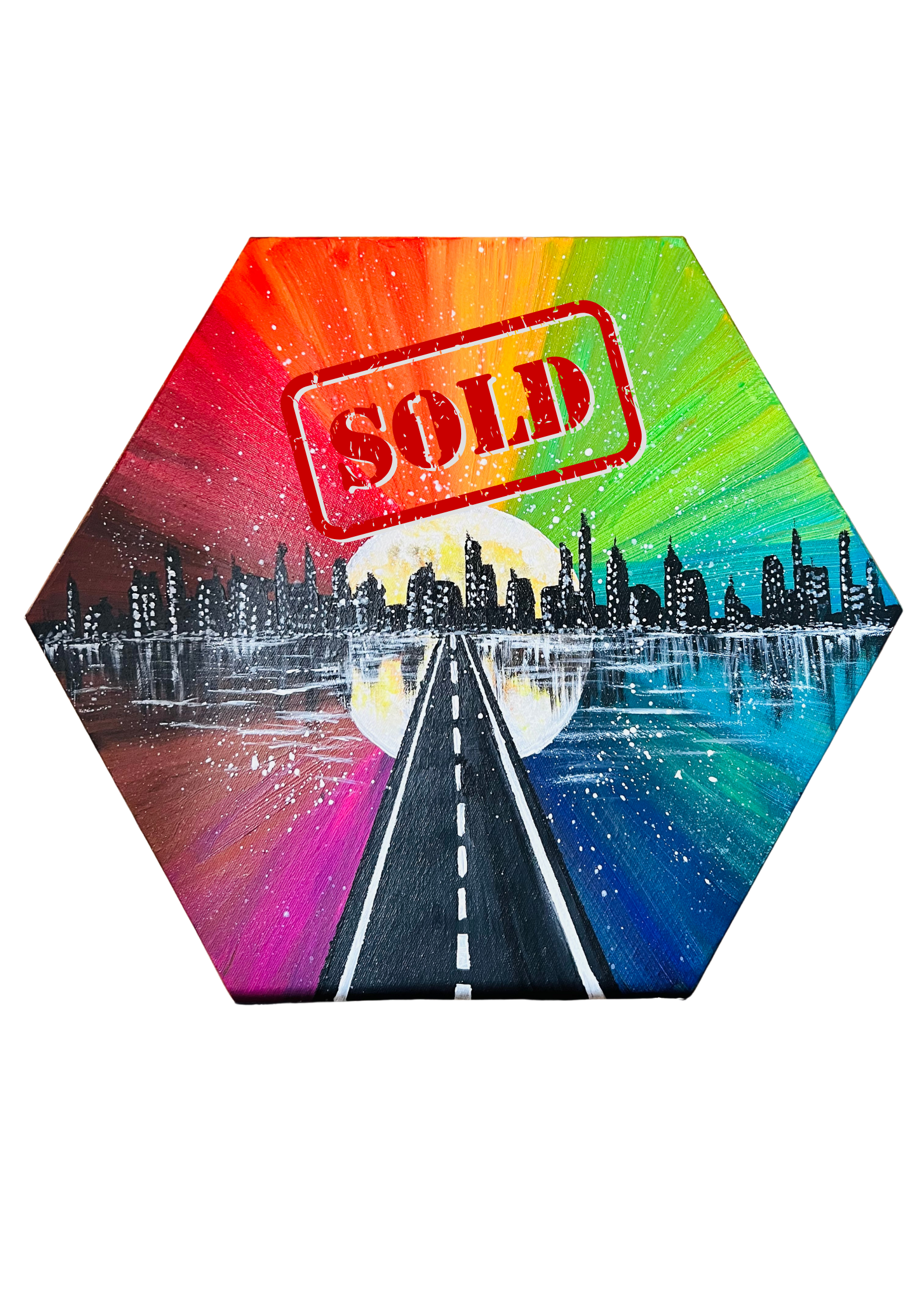 Experience the enchanting beauty of THE MOON CITY with its RAINBOW BACKGROUND and BIG BRIGHT MOON. Let the vibrant colors and dazzling light transport you to a cityscape filled with endless possibilities. Follow the road that leads to a bustling metropolis with towering highrise buildings. A dreamy adventure awaits you!