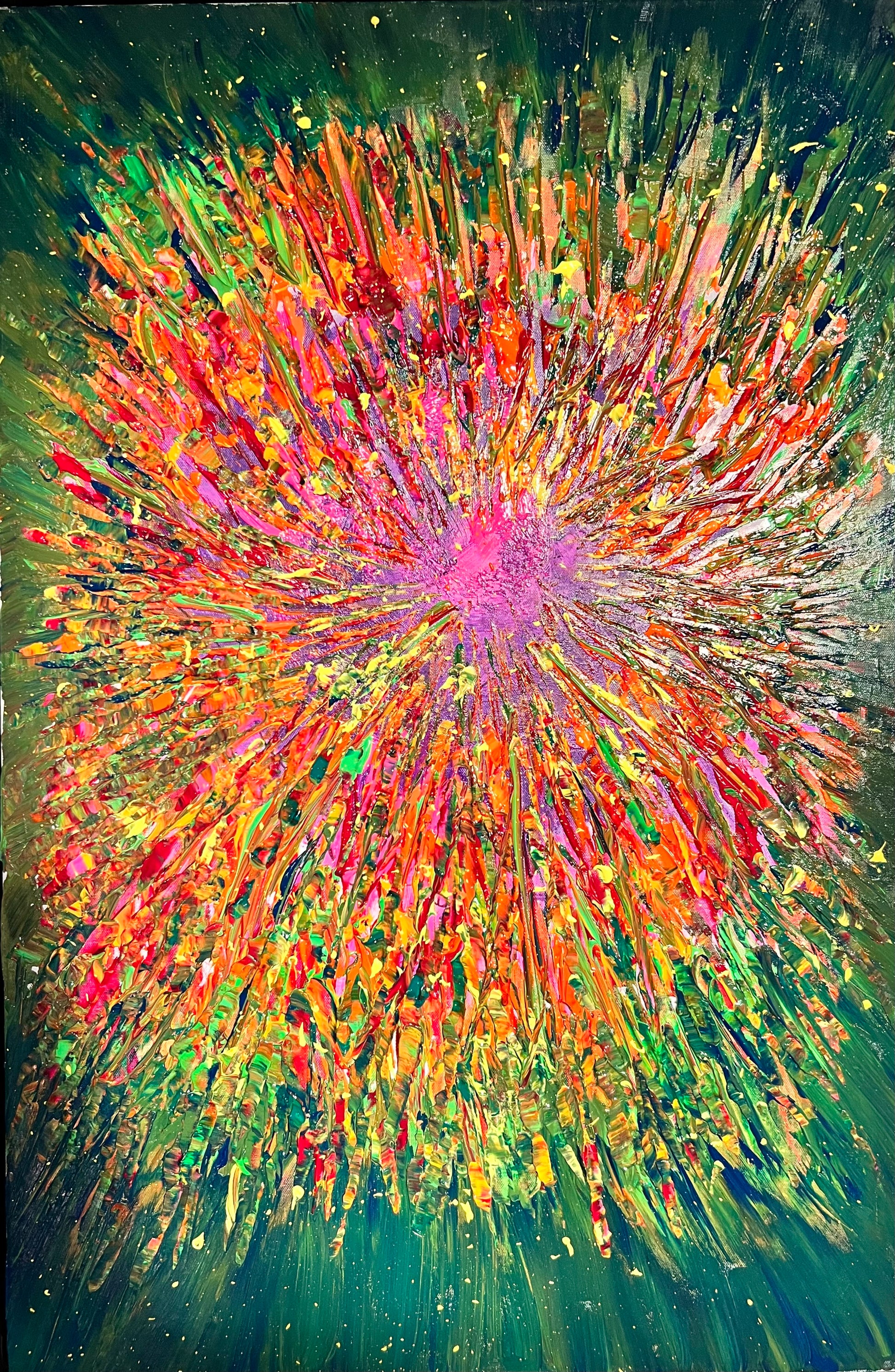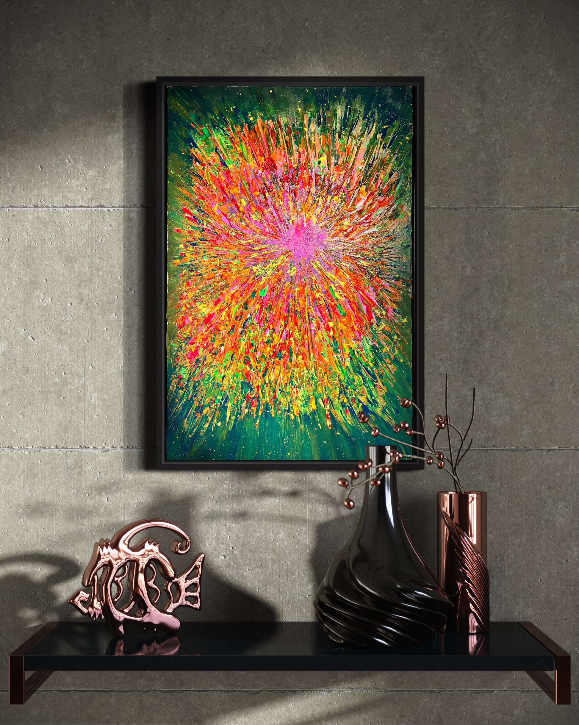 Created on 60x40cm canvas, this piece is finished with a sleek black floating frame that elevates its presence. It was born from a moment of exploding happiness and pure achievement ā the kind that fills your chest and spills out onto the canvas.