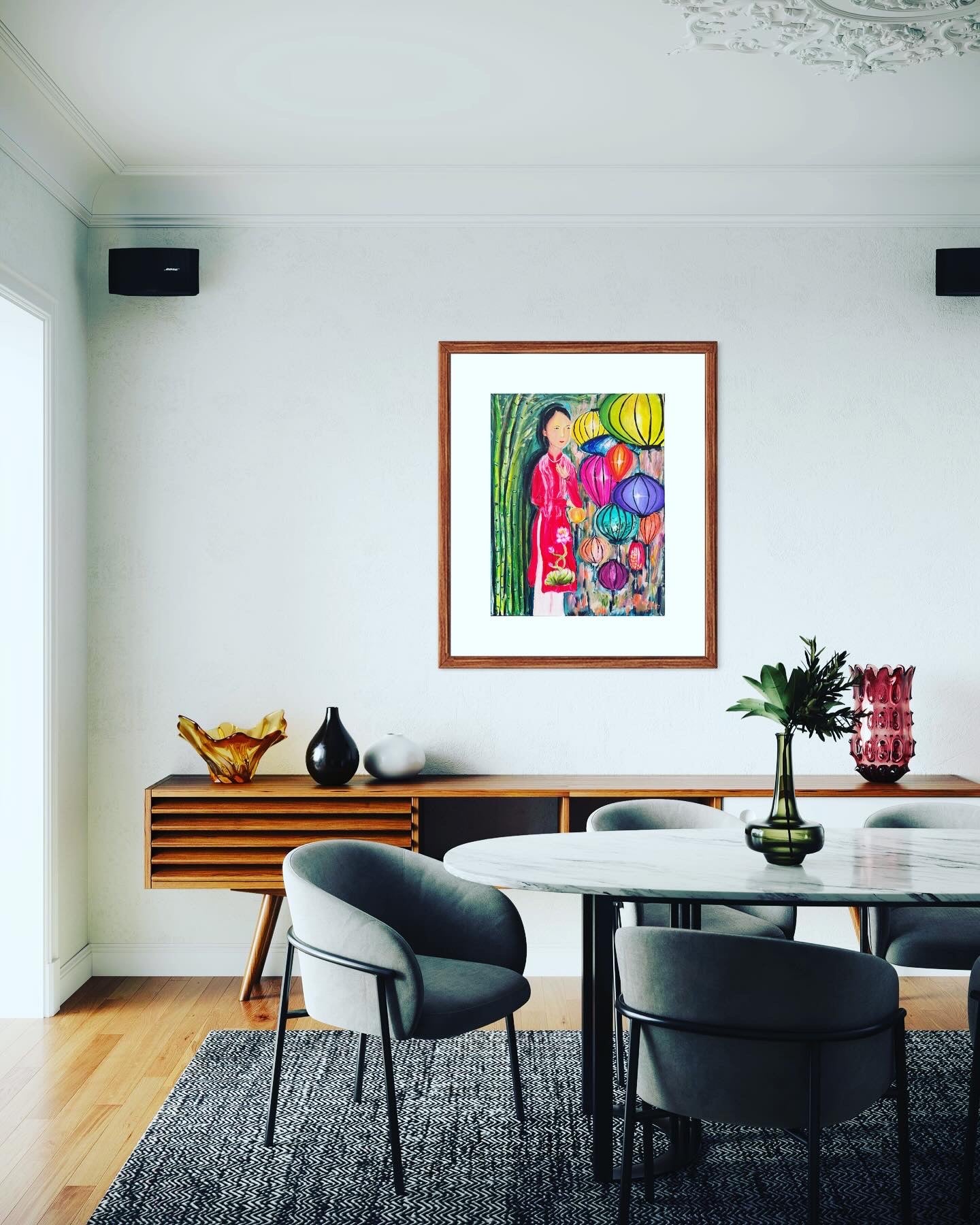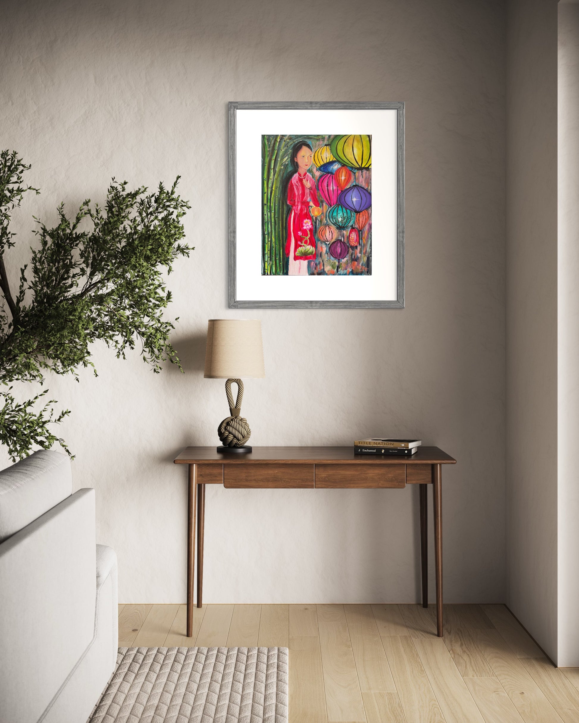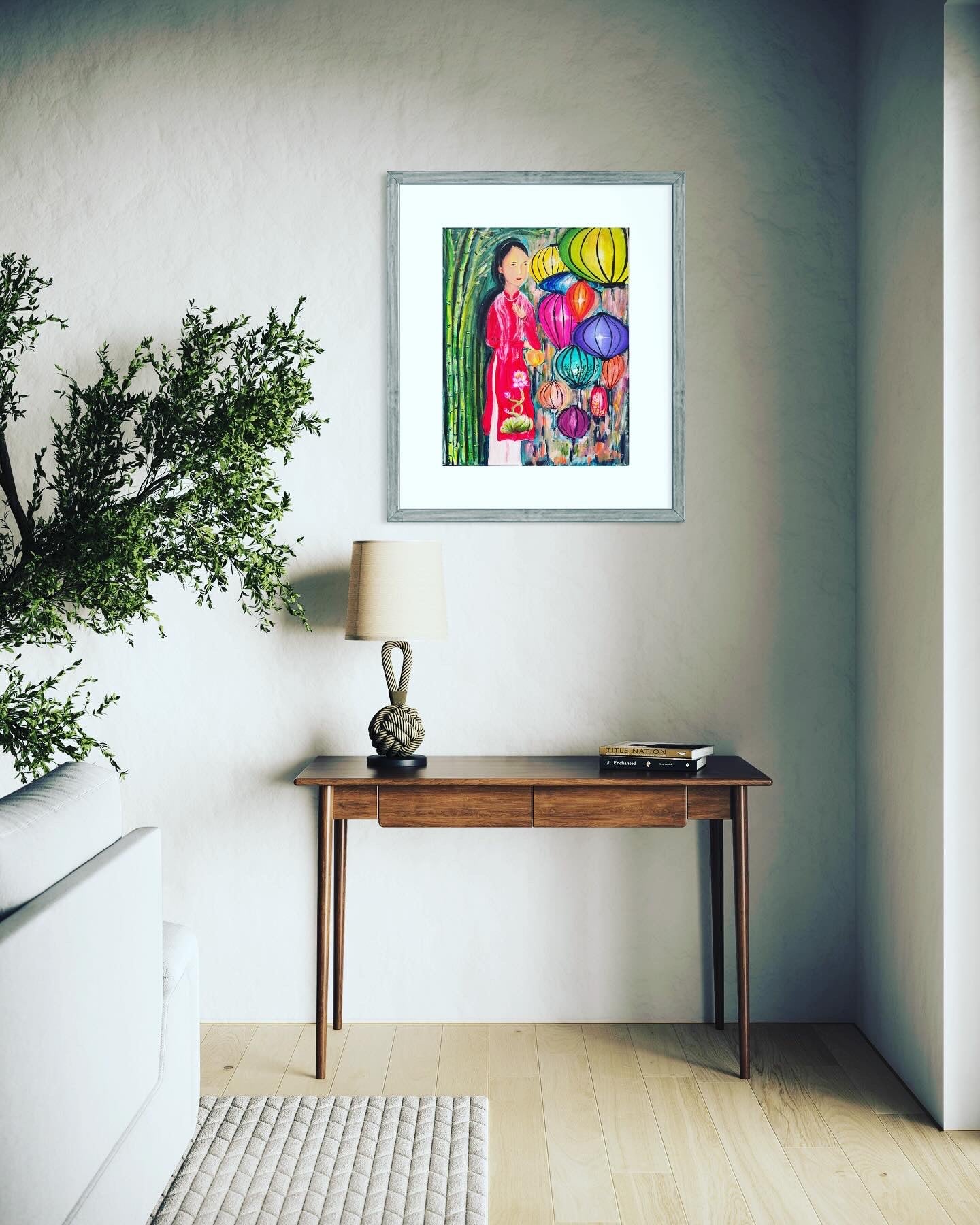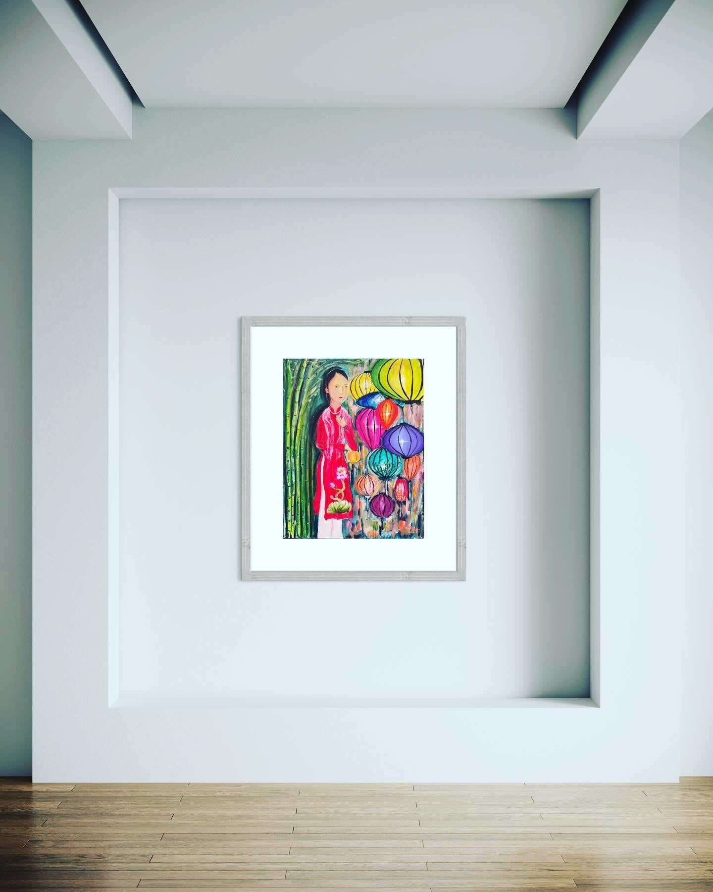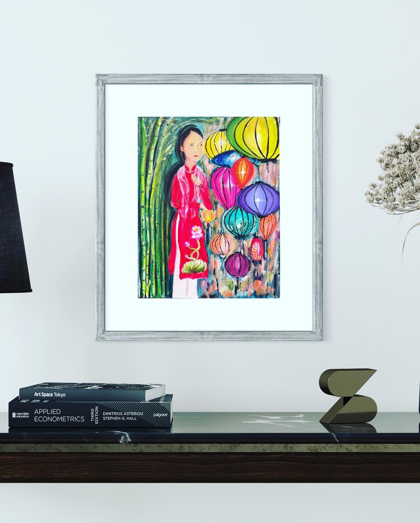 Get a glimpse of Vietnam with my Vietnamese Lady painting! Adorned in traditional dress, this lantent-fueled beauty is surrounded by delicate bamboo. A unique addition to any collection.